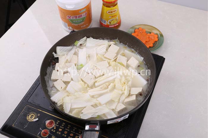 1.白菜洗凈后切長(zhǎng)片,豆腐切塊,胡蘿卜切片備用;