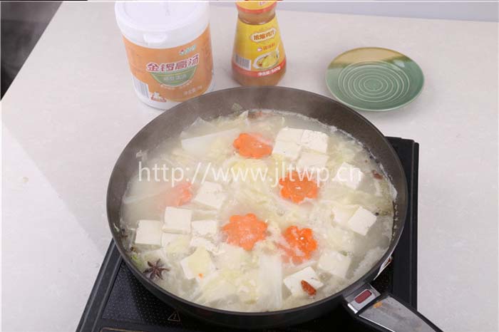 主料: 1.金鑼濃香雞骨高湯20g 2.金鑼雞汁10g 3.白菜150g 4.老豆腐150g 5.食鹽8g 6.白砂糖4g 7.胡蘿卜適量 8.水1.5Kg