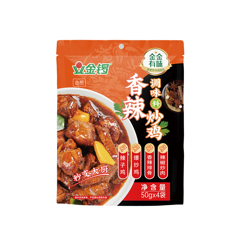 香辣炒雞調味料是采用金鑼非轉基因大豆油、黃豆醬、優質辣椒、釀造醬油等配料,經科學配方,結合現代化先進技術,精心加工而成的一款健康美味、使用便捷的產品。產品用于香辣炒雞菜品的制作,使用后菜品咸鮮入味,香辣撲鼻。