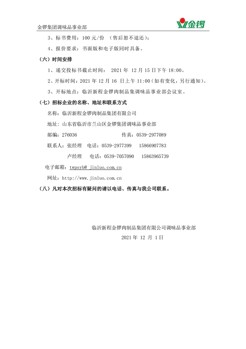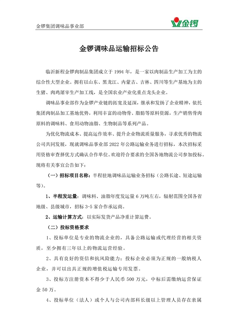 調味品事業部2022年運輸招標公告